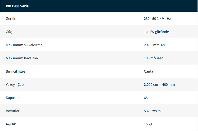 Kompakt, hafif ve güçlü WD1500 elektrikli süpürge, her ikisi de standart olarak bulunan toz kiti ve sıvı kiti sayesinde toz veya sıvı emişi için uygundur. Toz kiti bir polyester/naylon filtreden oluşur. Sıvı kiti, kap dolduğunda otomatik emme durdurma için bir şamandıradan oluşur.