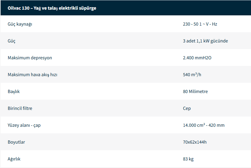 Yağ ve talaş elektrikli süpürgesi Oilvac 130, tipik elektrikli süpürgelerin kompaktlığını ve manevra kabiliyetini çıkarılabilir bir kap ve çift kademeli filtreleme ile kovaların muhafaza kapasitesiyle birleştirerek daha fazla takım tezgahının temizlenmesini sağlar.